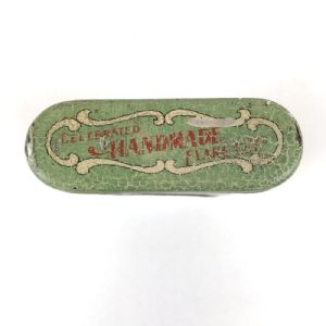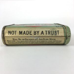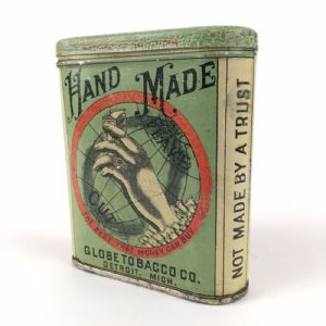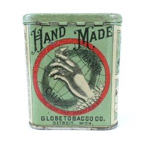 Rare Handmade Globe Pocket Tobacco Advertising tinRare early 1900s Globe Handmade Tobacco tin in excellent condition. Based in Detroit, Michigan, the company was established 1871 and grew to be one of the city’s largest companies, but by 1925 they were out of business. This is a difficult to find pocket tin. Nice crackle to the paint, scratch on top, on back, and a smaller one on one side, slight wear to edges. 4 inches high, 3.5 inches wide by 1.25. ITEM ID 3023 $150.00