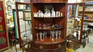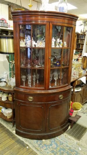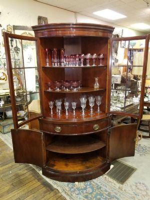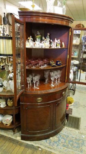 Here's a Drexel Mahogany Corner China Cabinet from the Travis Court Collection. There are 3 shelves and the 2 top shlves have plate rails. It has 1 drawer and the bottom section has 2 doors that are locked with a key. It is made of solid wood with no pressboard, this beautiful piece is in excellent condition. $475.00