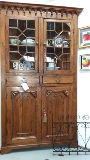 Pine, 18th century corner cupboard from Quebec Province, Canada, c 179018th century pine corner cupboard from Quebec Province, Canada. Pegged doors, original glass, Pendant drop carved detail under cornice molding. Beaded back boards. Stunning appearance. $1,800.00