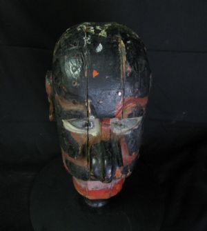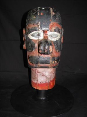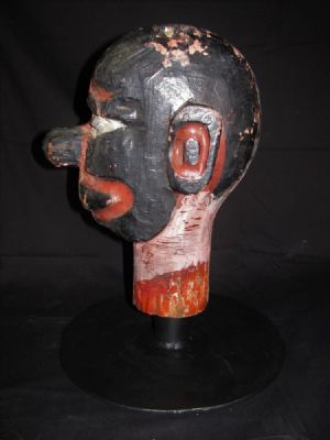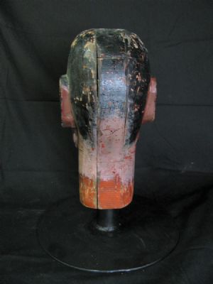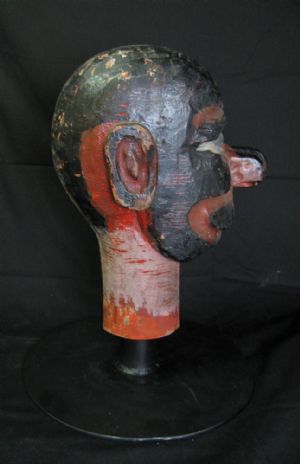 This is a head from a game manufactured by the Philadelphia Toboggan Company named Charlie's Hat. Several different heads were mounted in the round on wooden rods which rotated and moved up and down. Each head had a hat on it and the object was to knock the hat off the head and you win the hat. The heads were carved differently and also painted individually. Some that we have seen are even in "park paint" which means they were repainted by park employees when the original paint wore off. The heads are life size, so the size of a normal head. The heads are actually hand carved from blocks of wood glued together in the same manner that most carousel animals were carved. The Philadelphia Toboggan Company was one of the premier carousel manufactures in America.