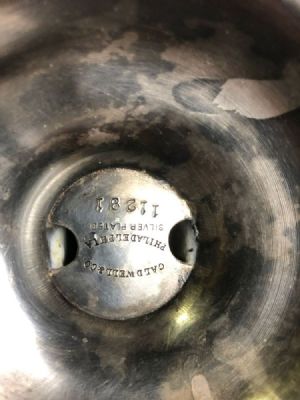 This is a wonderful trophy cup from 1909. The cup was presented to the winner of the 1909 Philadelphia Inquirer Regatta. I think the Regatta was held in Cape May, N.J. The cup is silver plate designed and made by a famous silversmith in Philadelphia J. Caldwell. There is a cool ships wheel in relief on the front of the cup and grape vines around the base. The cup is engraved as follows: Hallmarked on bottom by Caldwell & Co. Philadelphia Silver Plate 11281 The cup stands 10" tall and is 9" across handle tip to handle tip and 5 1/2" across the mouth. The finish does show signs of wear and the back is very slightly wavy. Otherwise very good condition. $1,150.00