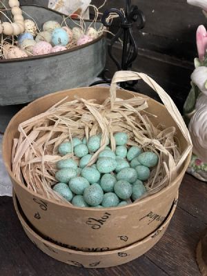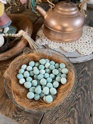Ceramic Small Farmhouse Inspired Eggs... They look so cute in just about anything and can be used well into summer .. we can ship as many as you want !! They come in many different colors or all the same color.. my favorite is the robin blue eggs $1.50