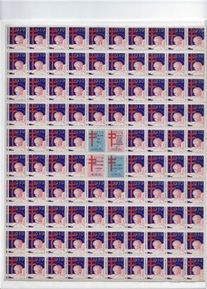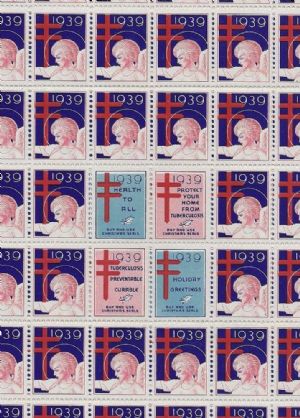 Rockwell Kent 1939 Tuberculosis Christmas SealsOne full sheet (100) of Rockwell Kent's 1939 "Angel of Mercy" Christmas Seals Stamps in ABSOLUTELY PRISTINE original condition. The Angel of Mercy, painted by Rockwell Kent's hand, levitates with her feet pointed toward the Earth and hands extended perpendicularly. Dressed in white, as pale as a tuberculosis patient's face, she drops yellow flowers from her palms and suggests that Americans "Buy Christmas Seals, Protect Your Home from Tuberculosis." The year was 1939, and Kent had been chosen to design the United States Christmas Seals for the National Tuberculosis Association. In November of that year, he presented a copy of his Christmas Seals art to President Franklin D. Roosevelt and Mrs. Ernest Grant, the director of the District of Columbia Tuberculosis Association. A photo of the occasion remains in the Rockwell Kent papers, Archives of American Art, the Smithsonian Institution. Kent only designed one set of Christmas Seals in his lifetime. Born in Tarrytown Heights, N.Y., in 1882, he was an accomplished painter and illustrator by the time he bought Asgaard Farm near AuSable Forks in 1927. Kent won commissions to paint wall murals at public buildings, galleries and museums. He made illustrations for billboards, printed pages and the popular press, including the covers of Scribner's magazine and the 1939 "Home Decorator and Color Guide" for Sherwin-Williams. Kent was well-known as an artist, an author and a political activist. He died in Plattsburgh in 1971.