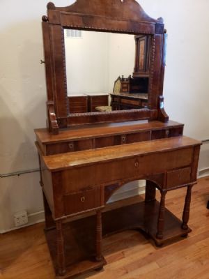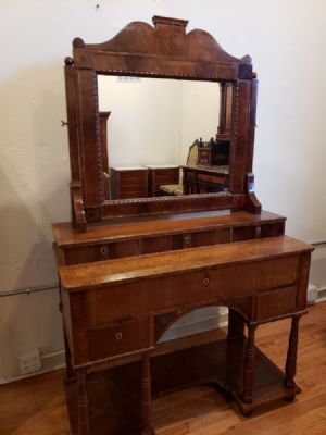 Desk with MirrorConvertible dresser, desk and make up table small drawers (key is missing) with pull down desk extension Biedermeier ca. 1830 Walnut wood 42.5" wide x 20" deep x 71" high $1,425.00