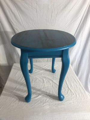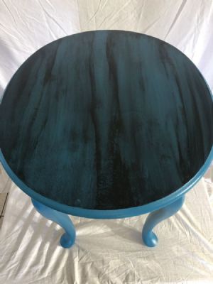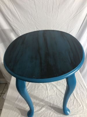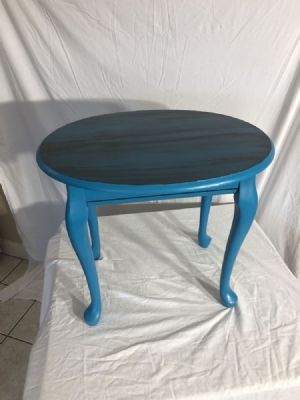 Oval shaped end table painted in peacock blue and black washed in caviar. Height 21” Width 21” Length 25”