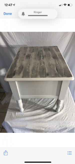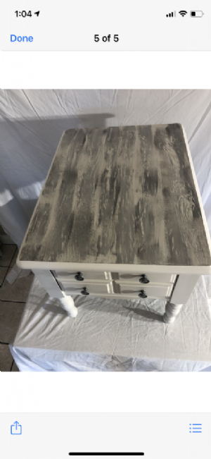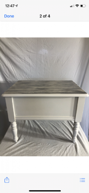 Side table is painted with fluff white chalk paint and has a a wood grain effect on the top painted with Hurricane Grey and Sawmill Gravy. Height is 21” Width is 20.5 “ Length is 27” $70.00