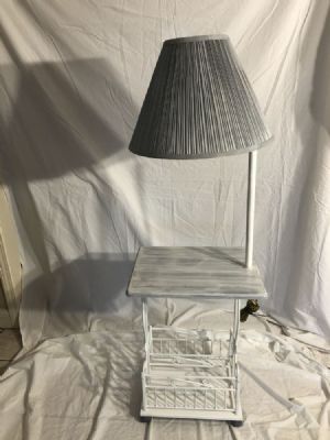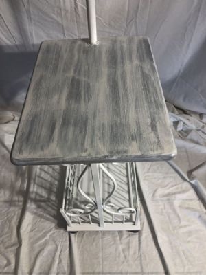 Table painted in white with a grey top and white washed with a Fluff Chalk paint. Lamp shade was painted in a country grey. Dimensions are: Lenght is 19.”, width is 14.5 “ ; height from floor to top of table is 26”; height from the floor to the top of shade is 58”; bottom of shade is 18”. $60.00