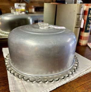 Aluminum cake taker with glass plateAluminum cake cover with glass plate from the 1950's. A cake plate cover is a type of tableware used for preserving cake and other pastries. In mid 1900s, this metal was important to save the cake from ants, rodents, and to keep it moist. $20.00