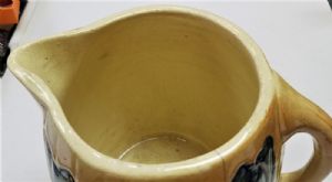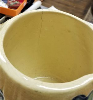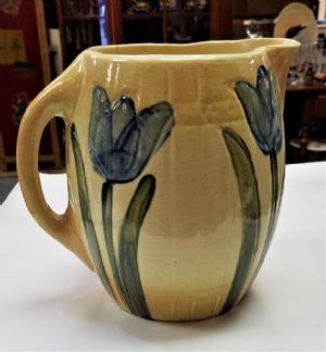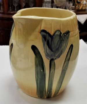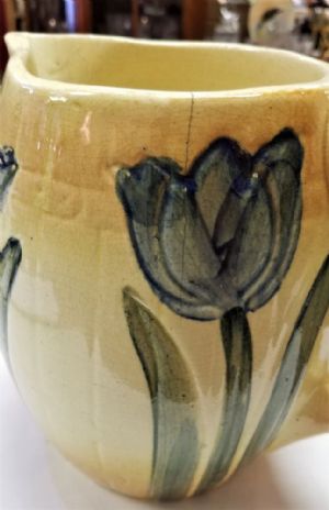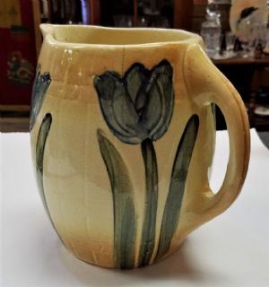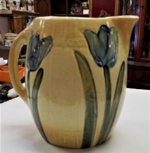 Roseville Tulip PitcherThis is an early Roseville Tulip Pitcher made around 1910. There is no mark but it's well known to be Roseville It has 4 blue tulips on a cream & light brown background and measures 7 1/2 inches tall x 8 inches from handle to spout. There is some crazing from age and a hairline crack (see pictures). Other than those issues tere are no chips or cracks. $80.00