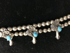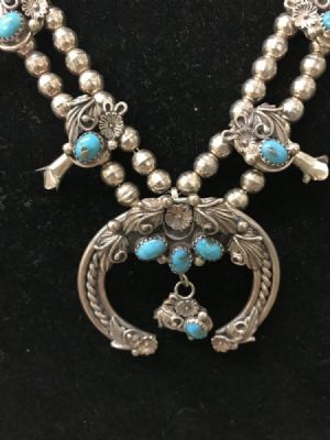 Sterling Silver squash blossom necklaceExceptional sterling silver Squash Blossom necklace will hang at about 9.5” from the clasp to the bottom. Beautiful condition. Sterling marks on the back. $750.00